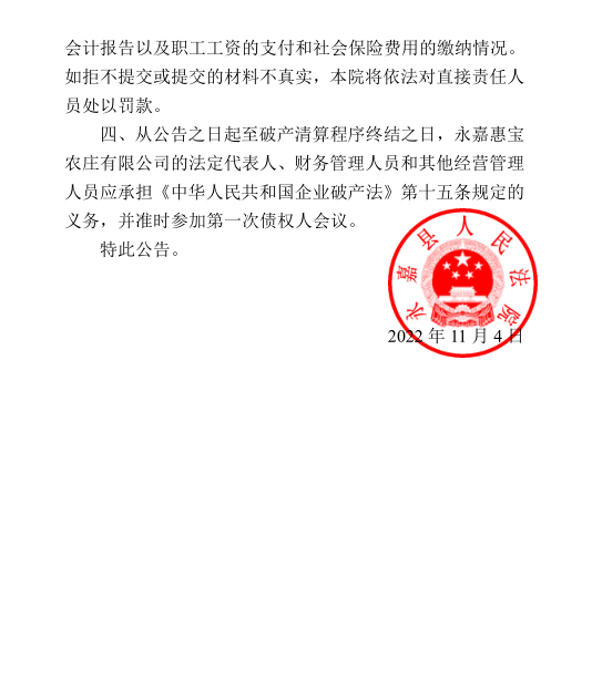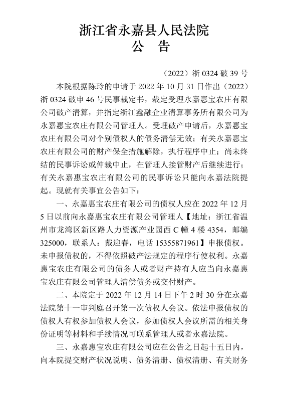永嘉惠寶農莊有限公司破產清算案公告