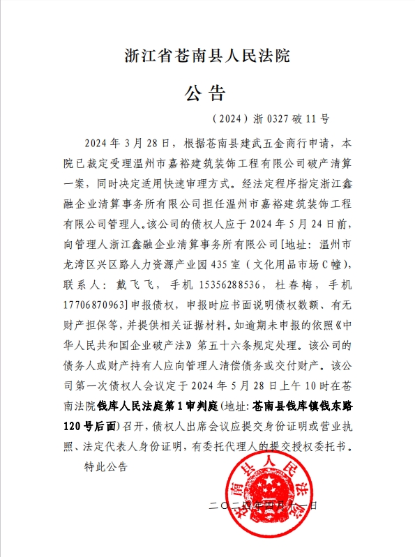 溫州市嘉裕建筑裝飾工程有限公司破產清算公告